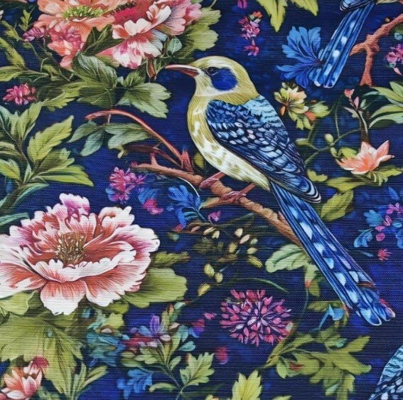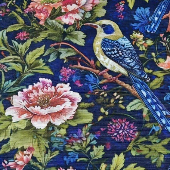 This tapestry floral fabric is a bird upholstery fabric for cushions, chairs, sofas, couches and stools. It is a peony flower fabric that can be used as an indoor fabric and outdoor fabric. This royal blue pink curtain fabric is 65% cotton and 35% polyester. It is a goldfinch fabric for pillows, cushions, throw pillows, bags, sofas, curtains, drapes and various sewing projects. This green leaves fabric can also be used as a furnishing fabric, furniture fabric, interior fabric, kitchen fabric, drapery fabric, throw pillow fabric, cushion fabric, sofa fabric, couch fabric, bench fabric, slipcover fabric, chair fabric, bedspread fabric, tablecloth fabric, dining chair fabric, curtain fabric, valance fabric, blind fabric, DIY fabric, bedding fabric, apron fabric, runner fabric, garden fabric, indoor tent fabric, tote bag fabric, picnic fabric, craft fabric, sewing fabric, quilting fabric or a home decor fabric.