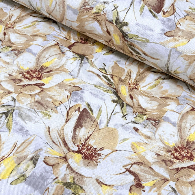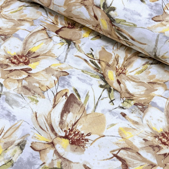 This water lily fabric is a beige floral upholstery fabric for cushions, chairs, sofas, couches and stools. It is a taupe floral curtain fabric that can be used as an indoor fabric and outdoor fabric. This watercolour fabric is 65% cotton and 35% polyester. It is durable, healthy and breathable. It is a watercolour floral fabric for pillows, cushions, throw pillows, bags, sofas, curtains, drapes and various sewing projects. This neutral fabric can also be used as a furnishing fabric, furniture fabric, interior fabric, kitchen fabric, drapery fabric, throw pillow fabric, cushion fabric, sofa fabric, couch fabric, bench fabric, slipcover fabric, chair fabric, bedspread fabric, tablecloth fabric, dining chair fabric, curtain fabric, valance fabric, blind fabric, DIY fabric, pillow fabric, bedding fabric, apron fabric, table runner fabric, garden fabric, indoor tent fabric, tote bag fabric, picnic fabric, craft fabric, sewing fabric, quilting fabric or a home decor fabric.