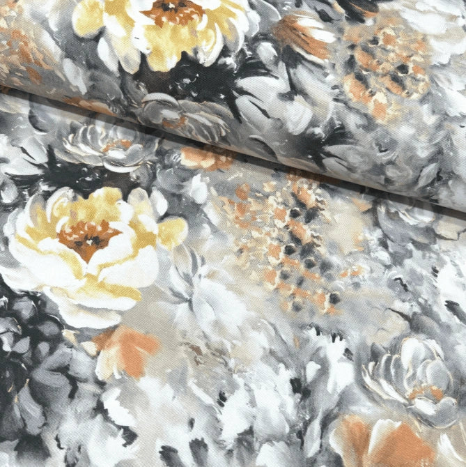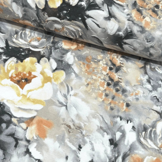 This yellow floral upholstery fabric is an ochre and grey fabric for pillows, cushions, sofas and couches. It is a boho curtain fabric that can also be used as indoor fabric and outdoor fabric. This oil painting fabric is 65% cotton and 35% polyester. It is an ochre floral fabric for bags, cushions, throw pillows, sofas, curtains and various sewing projects. This yellow floral curtain fabric can also be used as a floral curtain fabric, tablecloth fabric or runner fabric.