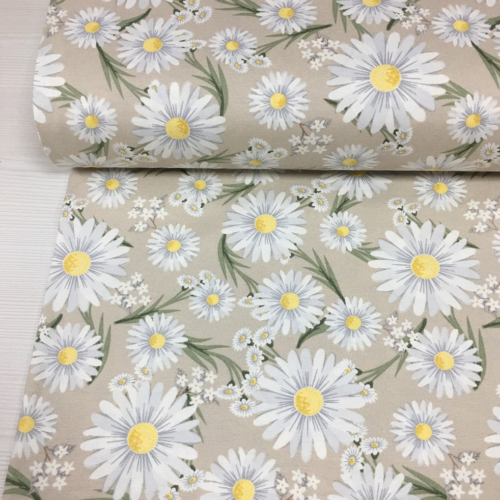Daisy Flower Print Fabric, Beige Floral Upholstery Curtain Cotton Canvas Fabric