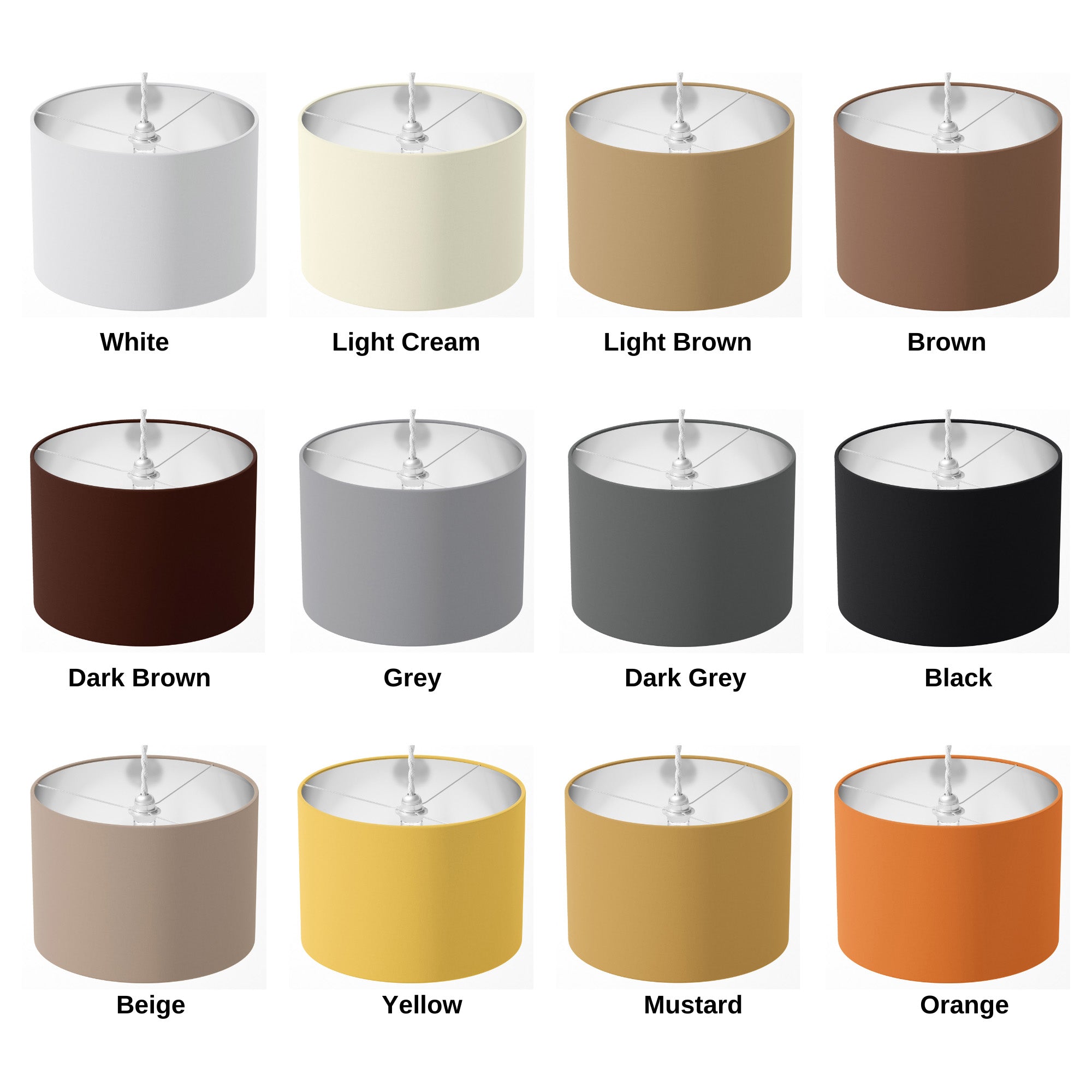 There are 12 colour options in this listing; White Lampshade, Light Cream Lampshade, Light Brown Lampshade, Brown Lampshade, Dark Brown Lampshade, Grey Lampshade, Dark Grey Lampshade, Black Lampshade, Beige Lampshade, Yellow Lampshade, Mustard Lampshade and Orange Lampshade.
